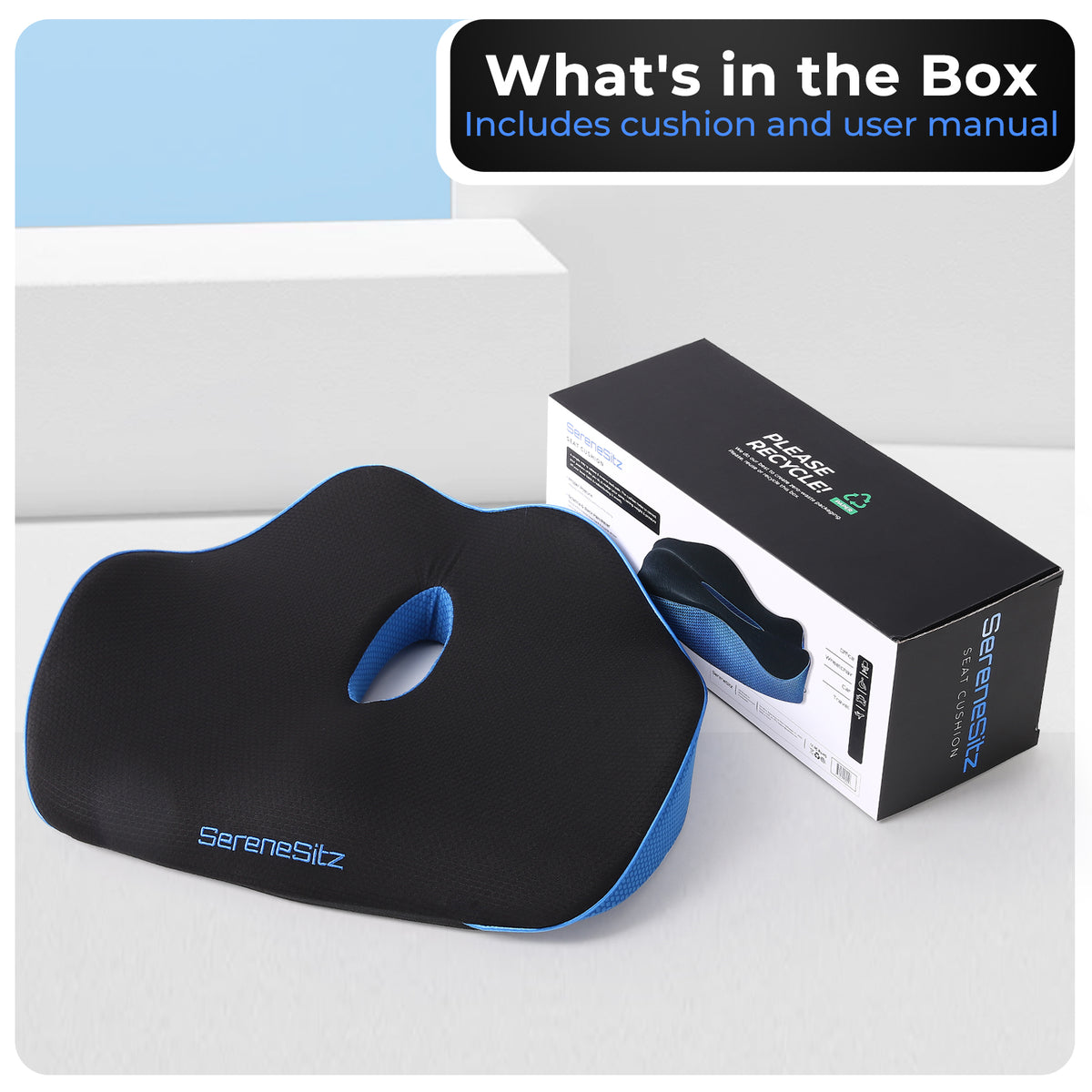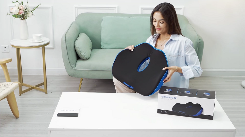 - Place the SERENSITZ cushion on your chair with the W-shaped cutout facing the back.